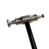 The Finish Master Long Handle is 19 inches long ( 47,5 cm ) and weights 7.5 ounces. It features a 13mm carbon fiber handle finished in a durable glossy clear coat. The New round handle and counter balance is made from 6061 billet aluminum that has been nickel plated for appearance and durability. The tip head is made from the same 6061 billet and is also nickel plated. The tip head has our exclusive tapper lock bore tip retention design. The specialty designs hammer head stem seats into a tapperd bore and snuggly locks into place. This will all but eliminate the attachments from becoming lose durning use. The included tips are a nearly flat 1 inch tip and a slightly more domed 1/2 inch tip. Both Tips are made from 630 Stainless Steel that has been nickle plated. The Finish Master also comes in a short version at 12 inches long. All 5/16 Treads!